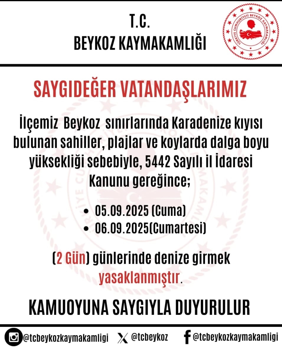 Beykoz Kaymakamlığı, olumsuz hava koşullarına bağlı olarak 05 – 06 Eylül’de denize girmeyi yasakladı.