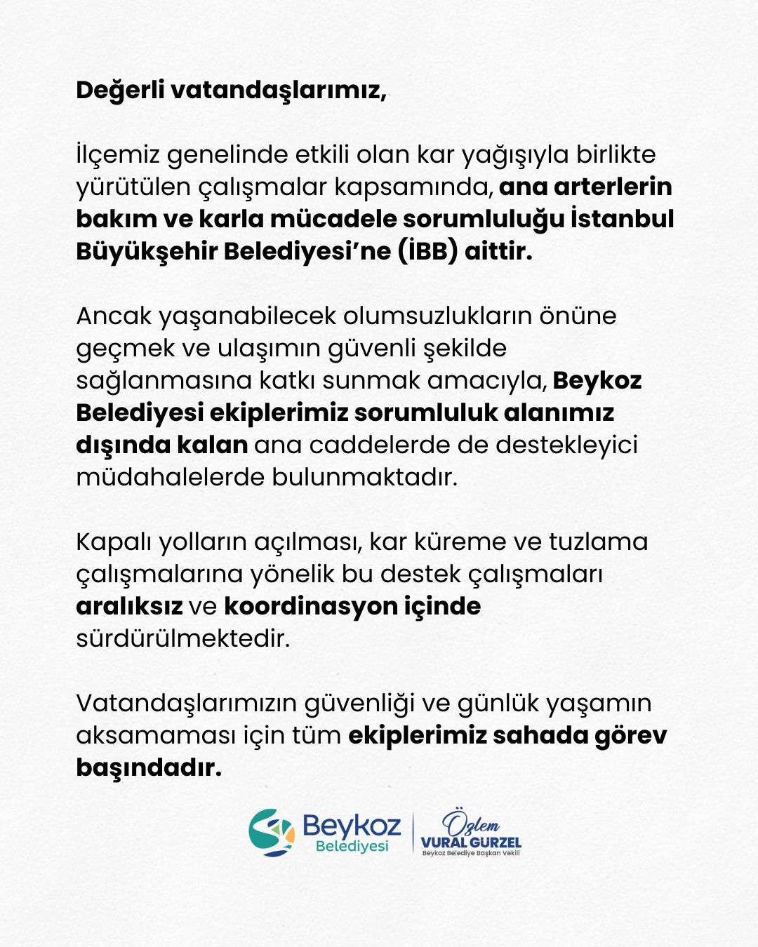 Beykoz’da etkili olan kar yağışıyla birlikte ilçe genelinde karla mücadele çalışmaları sürdürülüyor. Beykoz Belediyesi kış çalışmalarına ilişkin gerçekleştirdiği sosyal medya paylaşımında ilçe sakinlerine ana arterlerin bakım ve karla mücadele sorumluluğu İstanbul Büyükşehir Belediyesi’ne ait olduğunu hatırlattı.