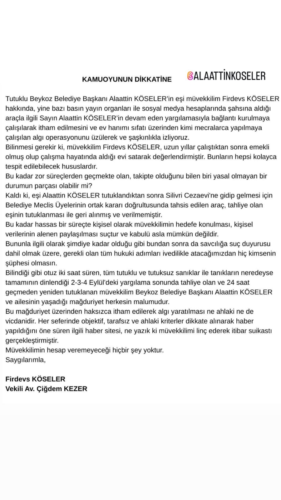 Beykoz Belediye Başkanı Alaattin Köseler’in sosyal medya hesaplarında yayınlanan açıklamayı orijinal haliyle okuyucularımıza aktarıyoruz.