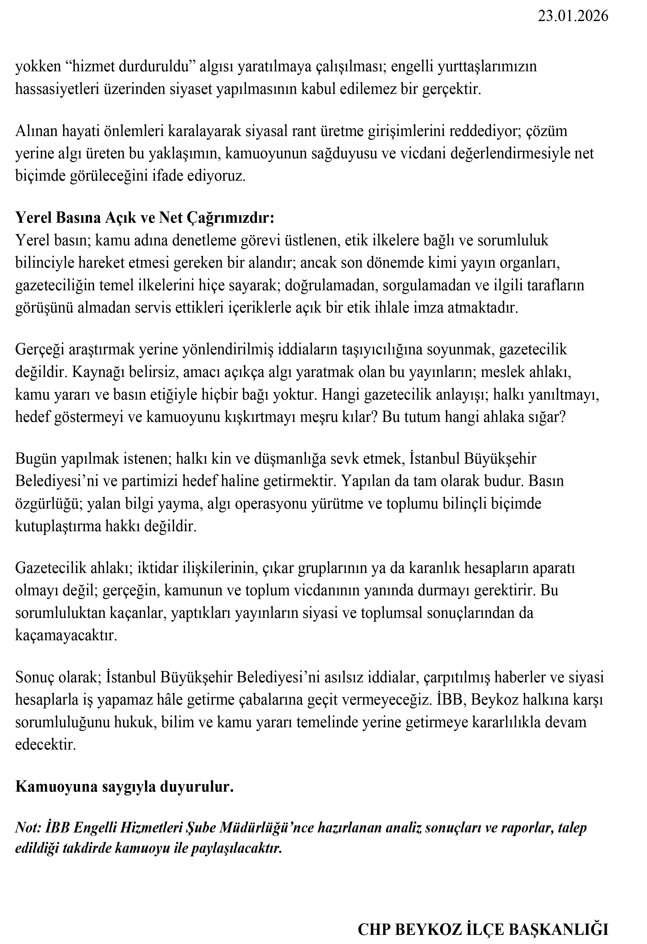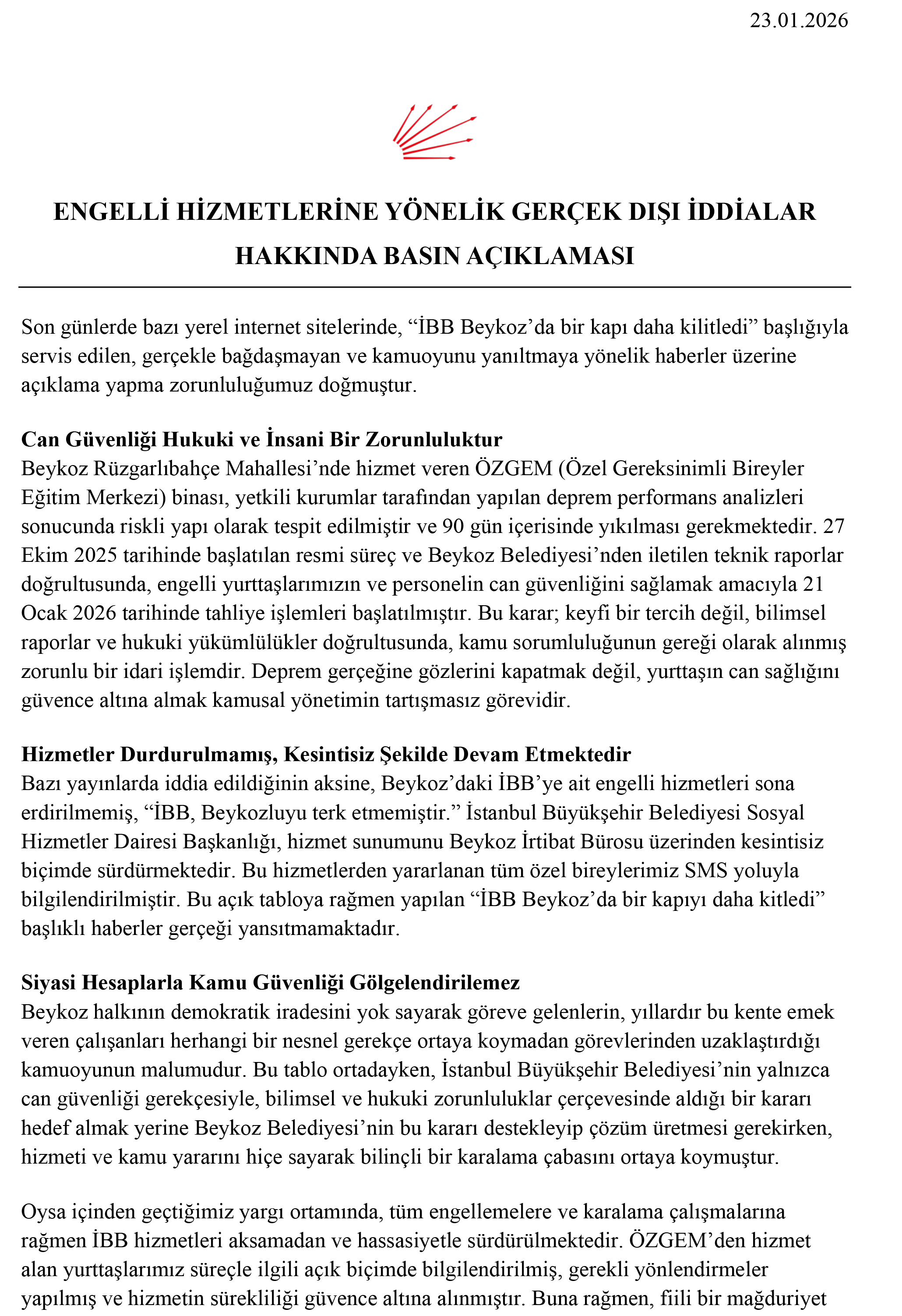 CHP Beykoz İlçe Başkanlığı, son günlerde bazı yerel internet sitelerinde yer alan “İBB Beykoz’da bir kapı daha kilitledi” başlıklı haberlere ilişkin yazılı bir basın açıklaması yaptı. Açıklamada, Beykoz Rüzgarlıbahçe Mahallesi’nde hizmet veren ÖZGEM (Özel Gereksinimli Bireyler Eğitim Merkezi) binasının deprem performans analizleri sonucunda riskli yapı olarak tespit edildiği ve tahliye kararının can güvenliği gerekçesiyle alındığı vurgulandı.