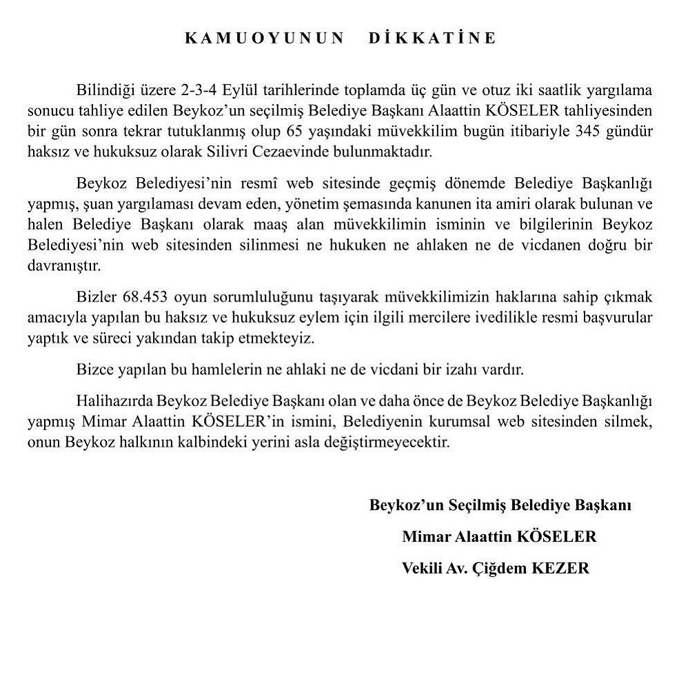 Silivri’de tutuklu bulunan Beykoz’un seçilmiş Belediye Başkanı Mimar Alaattin Köseler’in isminin belediyenin resmi web sitesinden kaldırılması sonrası Avukatı Çiğdem Kezer’den açıklama geldi. Açıklamasında Kezer: “Mimar Alaattin Köseler’in ismini, belediyenin kurumsal web sitesinden silmek, onun Beykoz halkının kalbindeki yerini asla değiştirmeyecektir.” dedi.