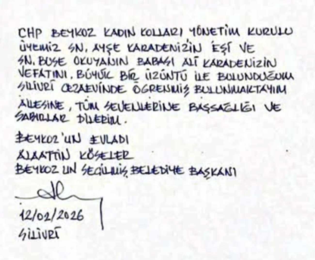 Beykoz Belediye emeklisi, CHP Beykoz İlçe Kadın Kolları Yönetim Kurulu Üyesi Ayşe Karadeniz’in eşi, Beykoz Belediyesi personeli Buse Okuyan’ın babası Beykoz’un eski esnaflarından Ali Karadeniz hakkın rahmetine kavuştu.