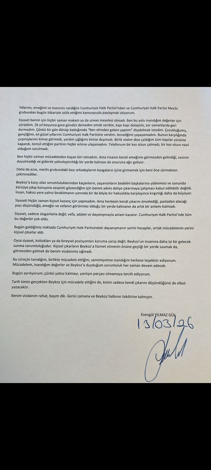 CHP Beykoz Belediye Meclis Üyesi Esengül Yılmaz Gül, partisinden ve CHP Meclis Grubundan istifa ettiğini duyurdu.