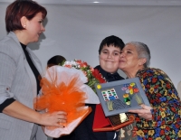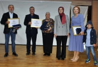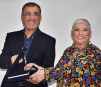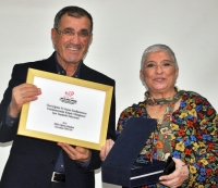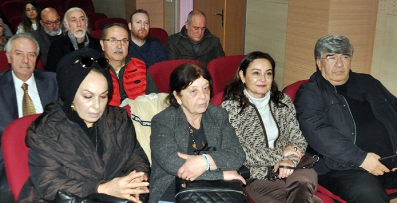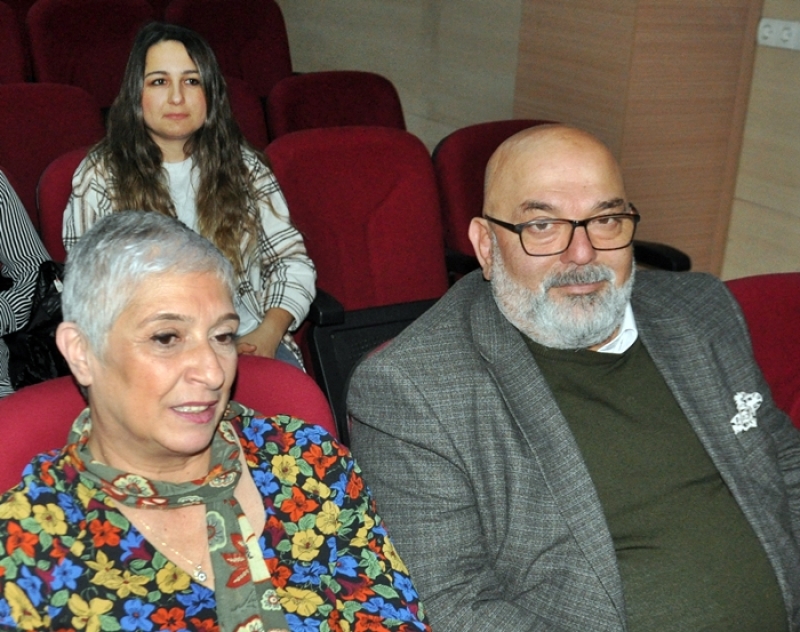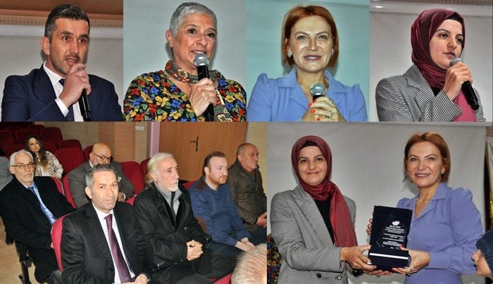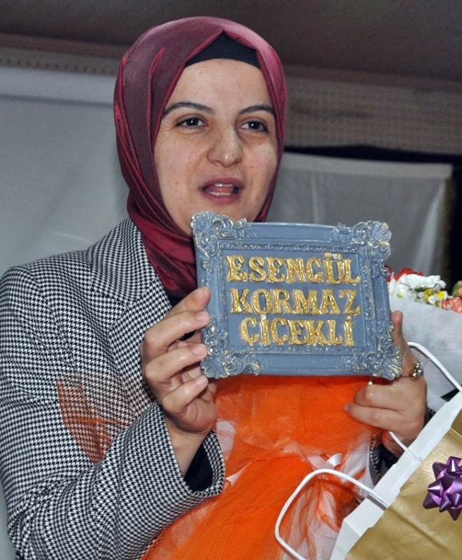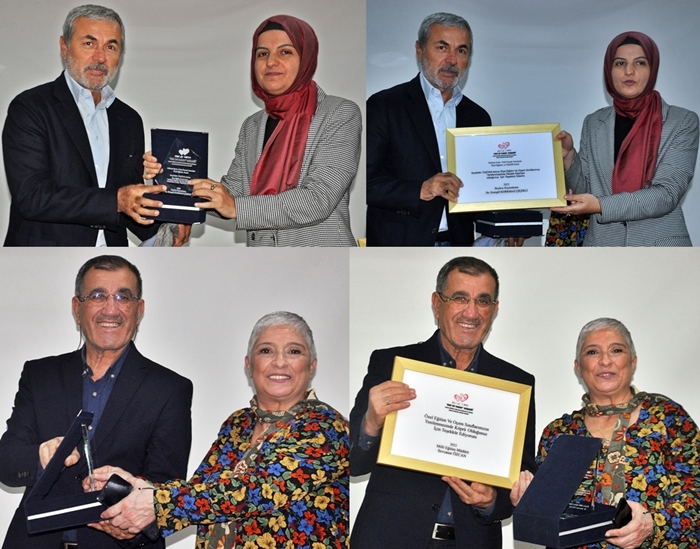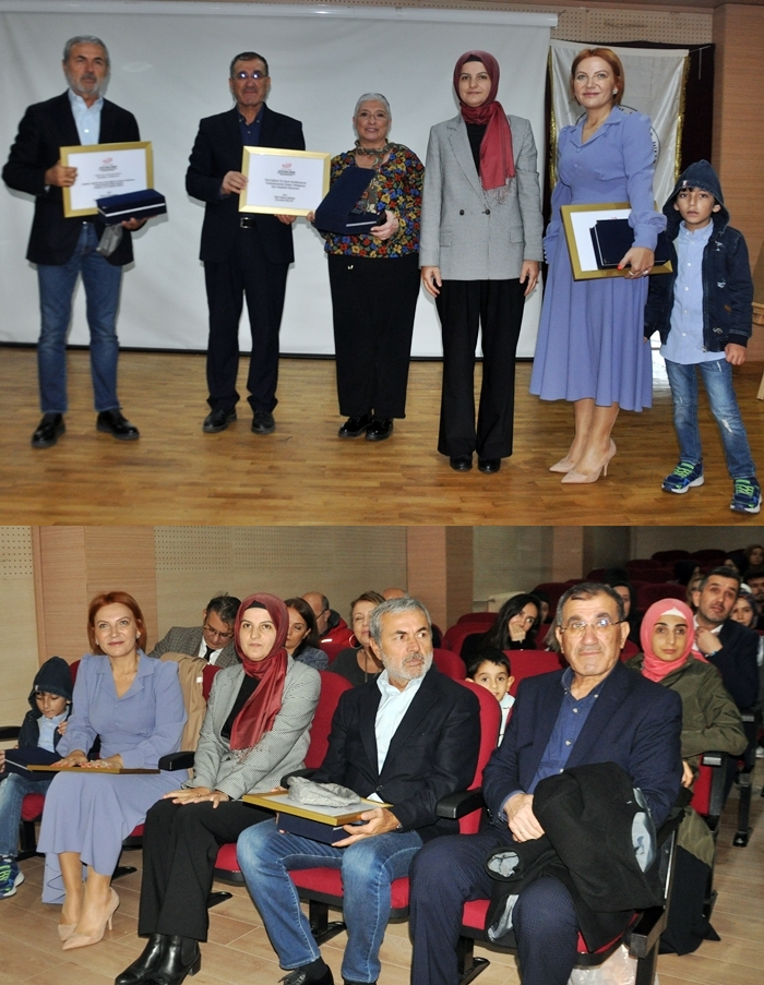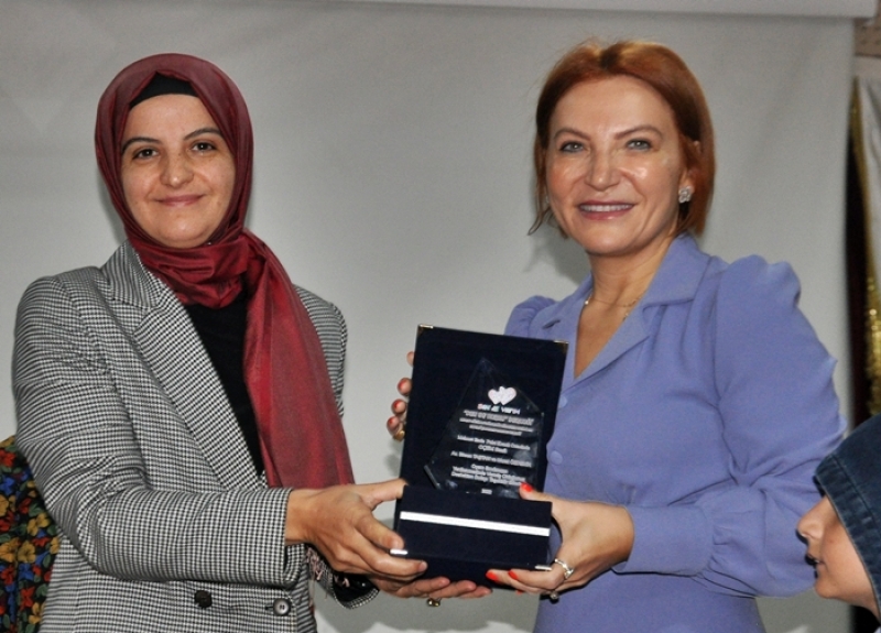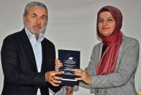 plaket takdim ederken, Birsen Taştan’ın eşi Seyfettin Taştan’ın plaket ve