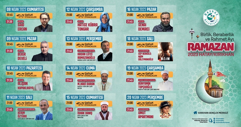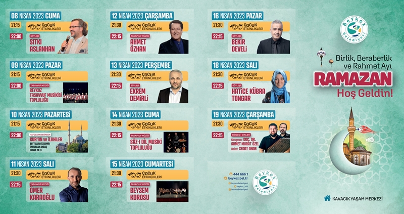 Beykoz Belediyesi’nin bu yıl Ramazan ayında, Beykoz’da ve deprem felaketinden etkilenen, kardeş şehir Hatay Kırıkhan’da düzenleyeceği Kültür Sanat Faaliyetlerini okuyucularımızla paylaşıyoruz.